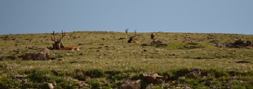 Lorsque nous sommes partis d'Estes Park pour poursuivre notre périple nous avons roulé à travers le Parc National des Rocheuses en suivant la "Trail Ridge Road" qui serpente jusqu'à 3713 mètres d'altitude. Arrivés quasiment au point culminant nous avons vu tout un groupe de wapitis qui se prélassaient.